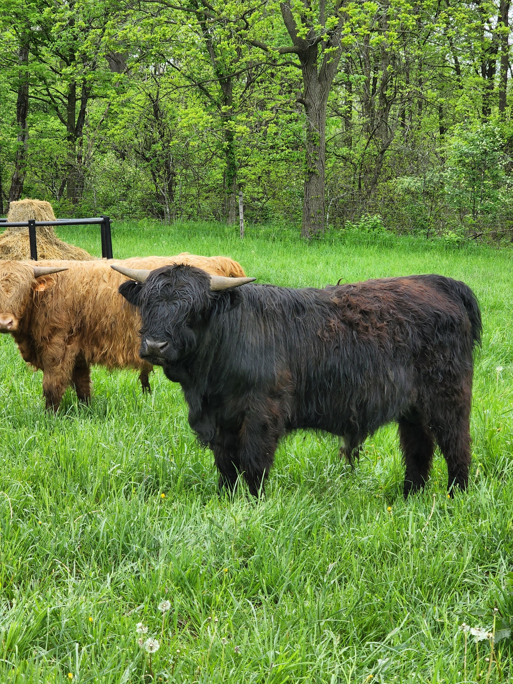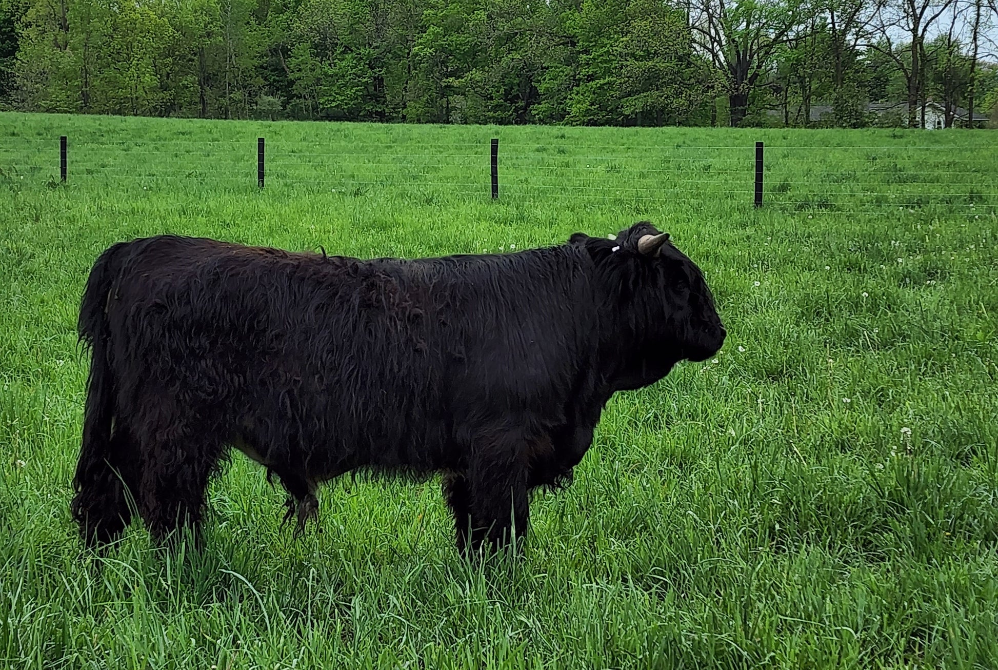 This young black bull is now a herd sire in WI. He was purchased by LEA-White Farms along with a half brother, with the idea of keeping one and selling the other. However, we couldn't resist collecting him prior to his sale. Well mannered, excellent semen quality, this bull carries both a black and red gene at the MC1R locus, so he can produce calves of any color. He is registered with the American Highland Cattle Association, all offspring out of AHCA registered females are eligible for AHCA registration themselves.