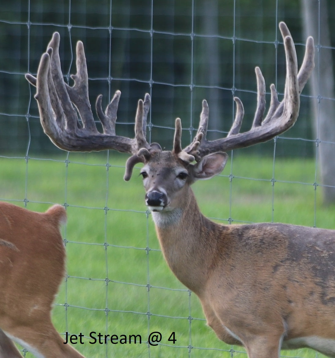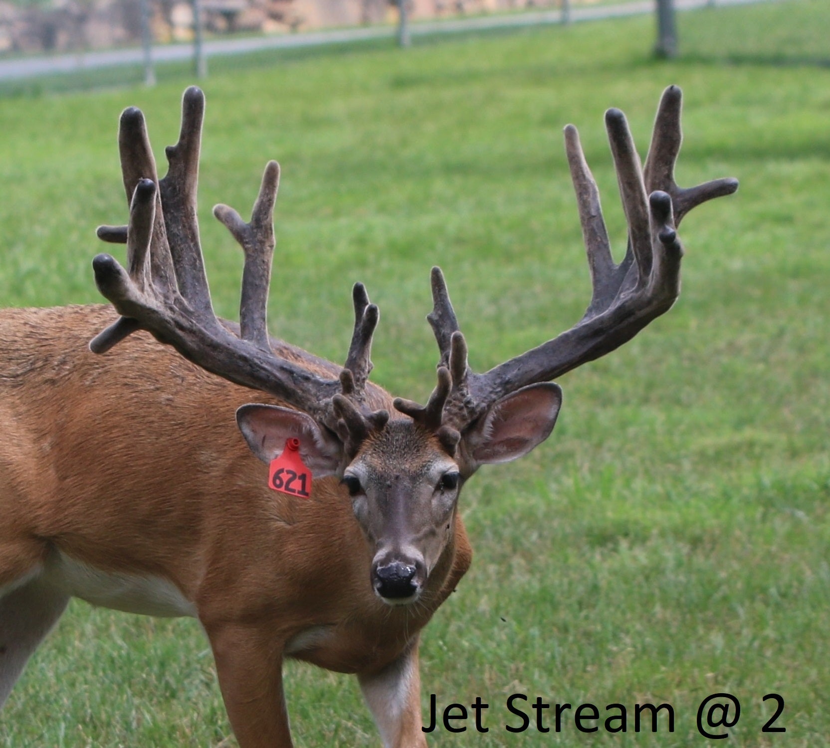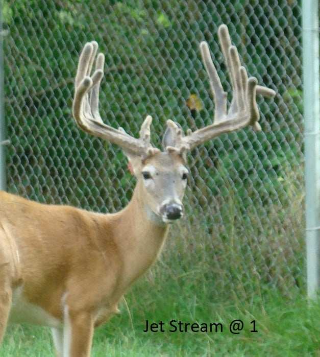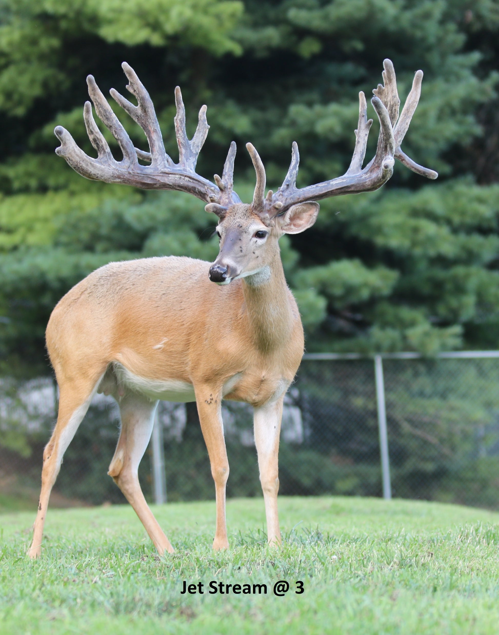Jet Stream received 1st place typical mature award at NADeFA. His typical score is 258” and gross scored 289” @ 4. 31¼” inside spread, and longest beam is 33½”.Jet Stream is already proven to produce large typical frames such as Skyrocket. Jet Stream is a half brother to Blackjack. Jet Stream also received 3rd place typical award at NADeFA as a yearling.
