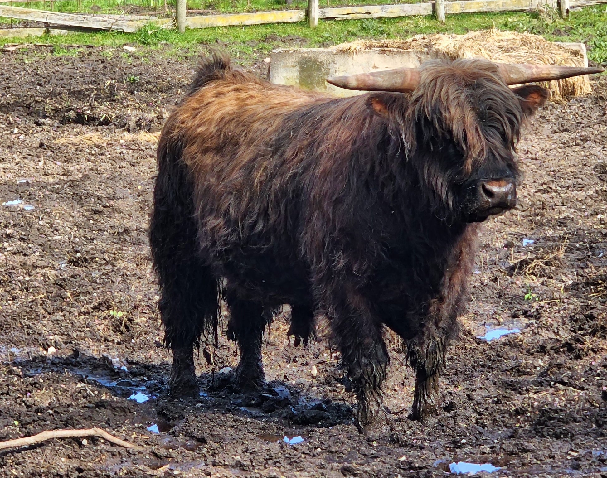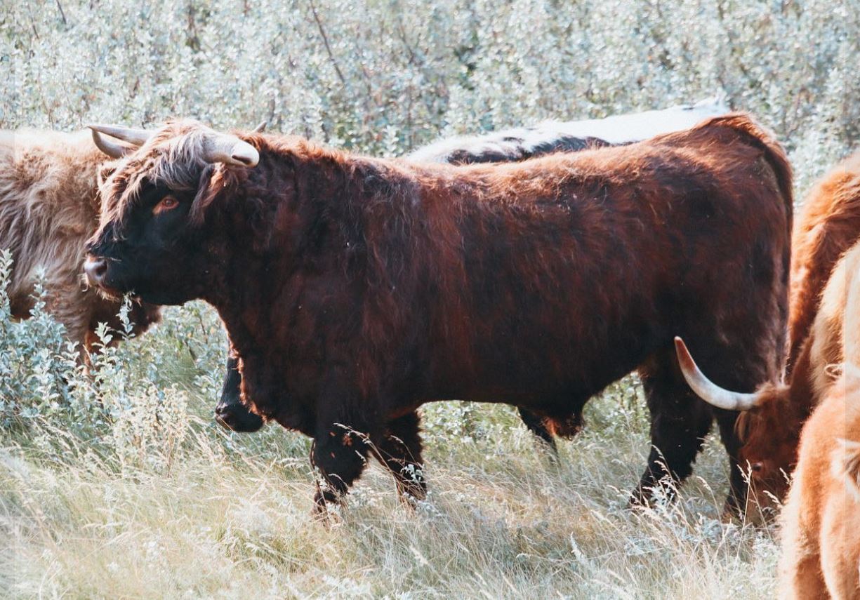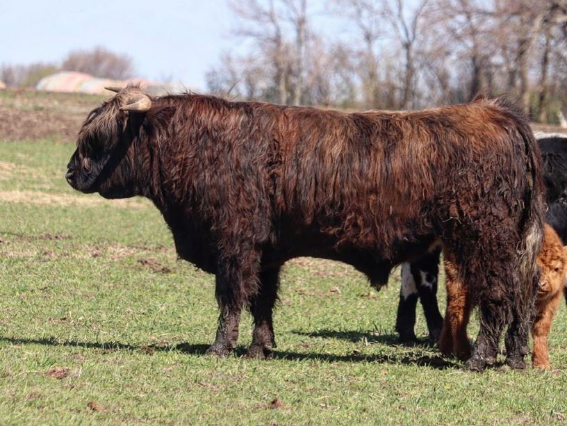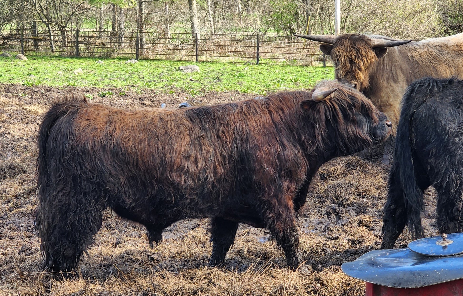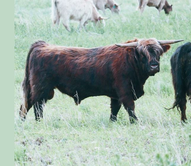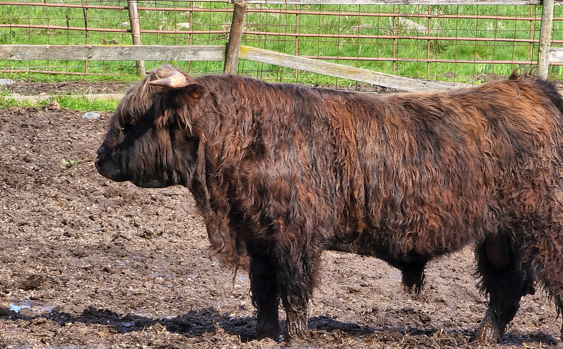 This striking young bull is now a herd sire in North Dakota. He is a dark red brindle with white "frosting" evident on the switch of his tail and forehead. This color pattern is unique, and while its exact mode of inheritance has not been determined, it appears to be a dominant trait, so that only animals exhibiting the color pattern can pass it to offspring. Quintessential is long, well muscled with an exceptional disposition. He is registered with the American Highland Cattle Association, all offspring out of AHCA registered females are eligible for AHCA registration themselves.
