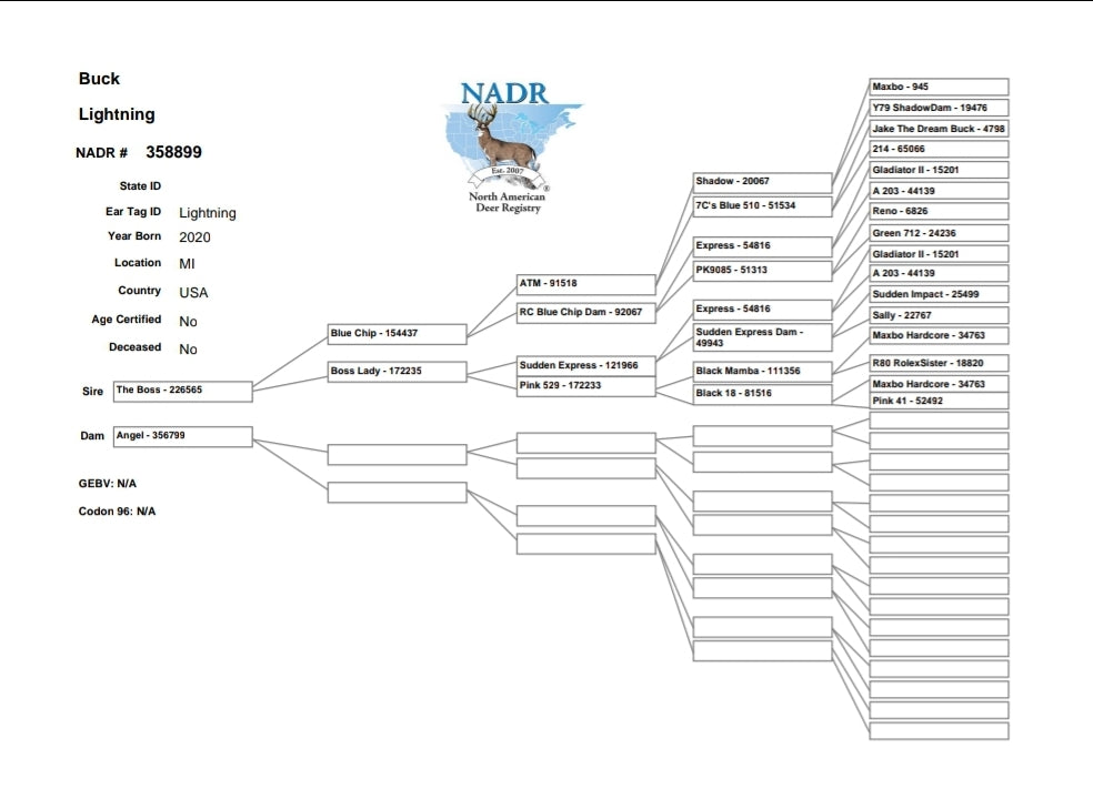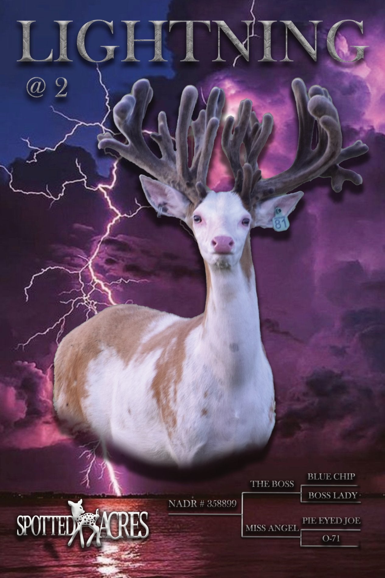 LIGHTNING IS THE WOMB BROTHER TO MAVERICK. HE ALSO HAS BEAUTIFUL COLOR THAT WILL GRASP YOUR ATTENTION, BUT ITS THE ANTLERS THAT GO WITH HIS COLOR THAT MAKES THIS GUY SO SPECIAL. HE DEFINITELY TAKES AFTER HIS DAD, “THE BOSS” WITH THIS CRAZY SET OF HORNS. WITH THEIR BIG PEDIGREES, LIGHTNING AND MAVERICK HAVE THE POTENTIAL TO BE SOME OF THE BIGGEST PIEBALD BUCKS EVER.