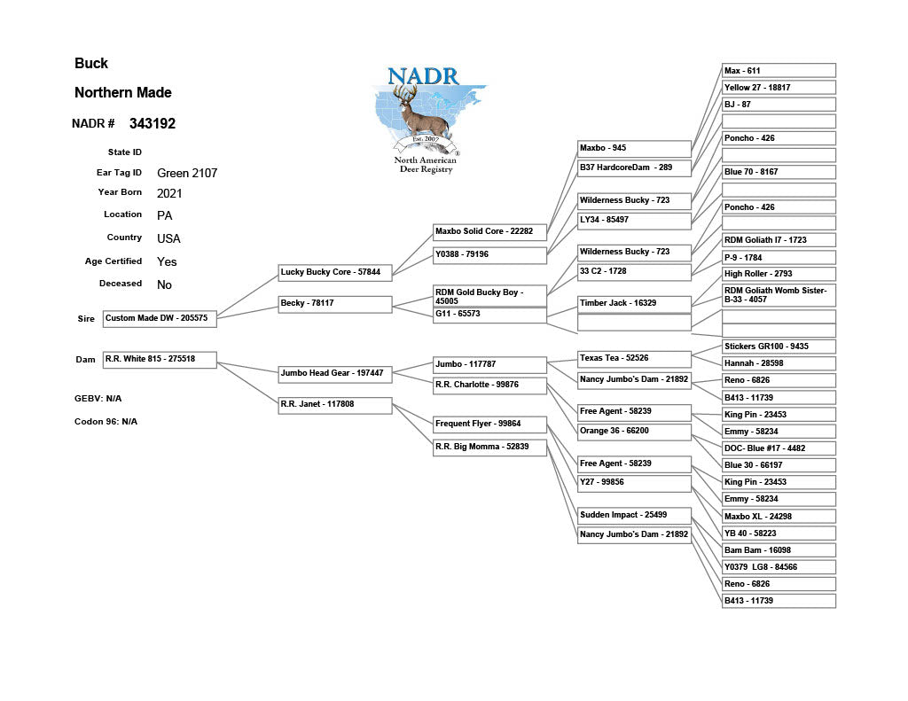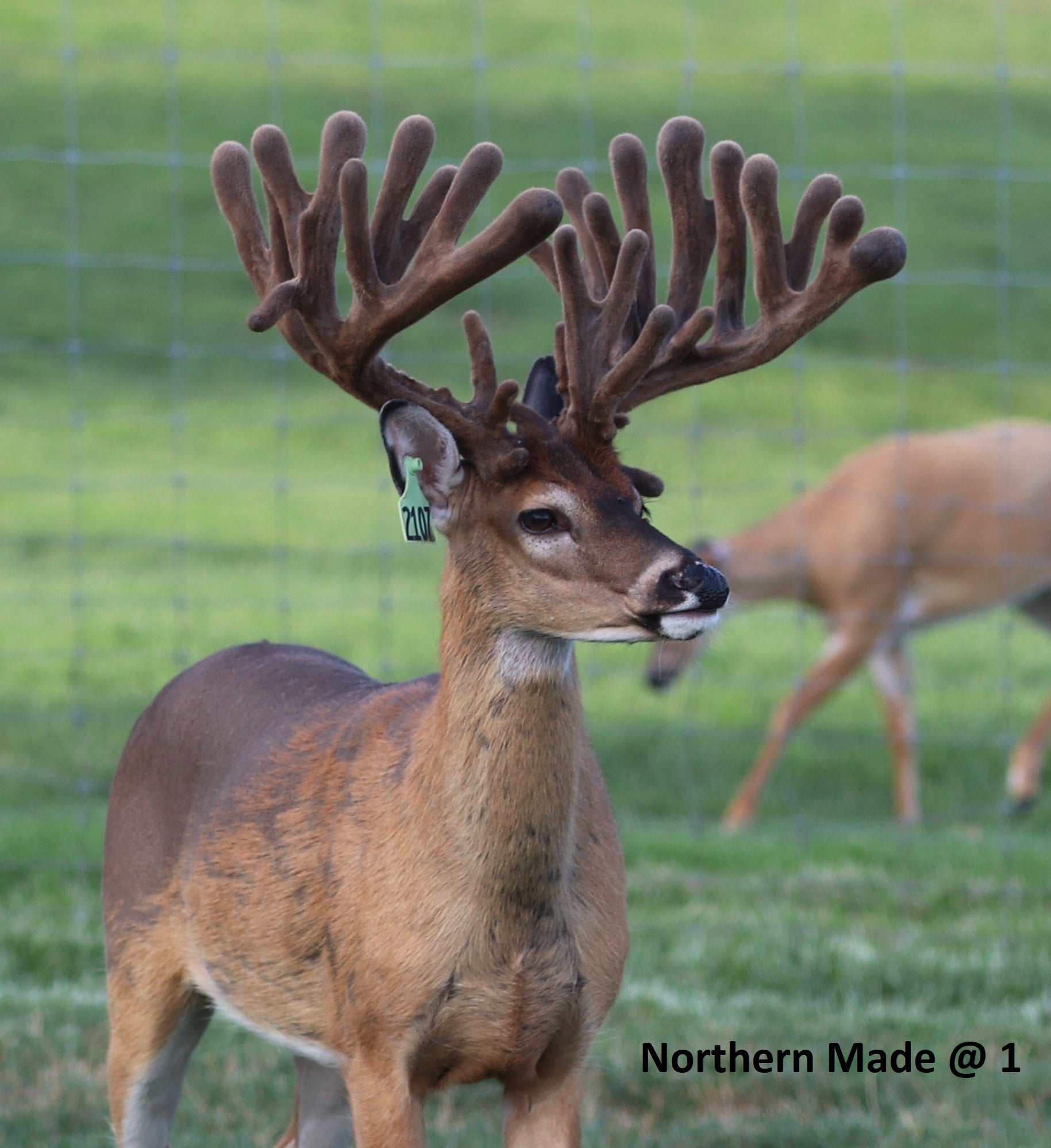 Northern Made scores 246" @ 1. Northern Made has great body size for a yearling and stacked with World Record Class genetics. Custom Made scoring 760" @ 9 currently the World Record mature, Jumbo Head Gear 697" @ 3 World Record 3 year old in 2017, Jumbo 411" @ 1 World Record yearling in 2012, Free Agent 392" @ 1 World Record yearling in 2009, Sudden Impact 281" @ 1 World Record yearling in 2007, Reno 201" @ 1 World Record yearling in 2004, Also Free Agent 528" @ 2 was the World Record 2 year old in 2010, and Sudden Impact 406" @ 2 was the World Record 2 year old in 2008 and the World Record 3 year old in 2009 scoring 492".