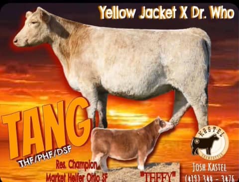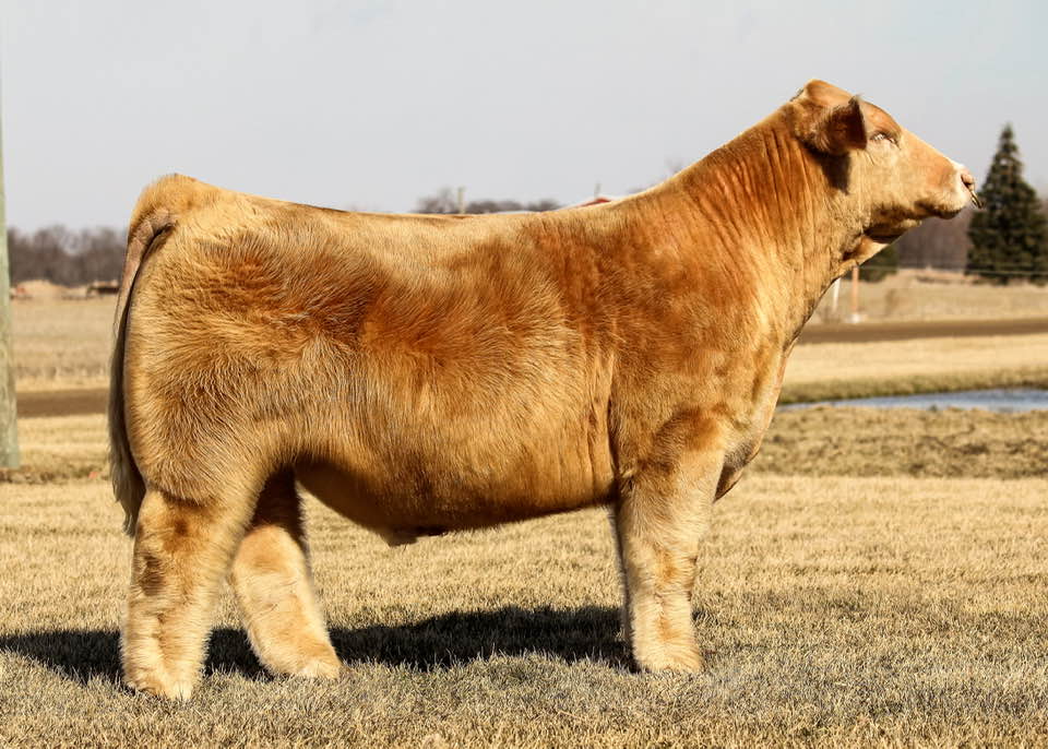 This stud is loose structured, incredible monster footed, yellow shag, great temperament and out of a dam who constantly produces champions! Maternal & full sibs have won at the state level! Schroeder family campaigned maternal sib who was Reserve Champion Market Heifer at Ohio State Fair.